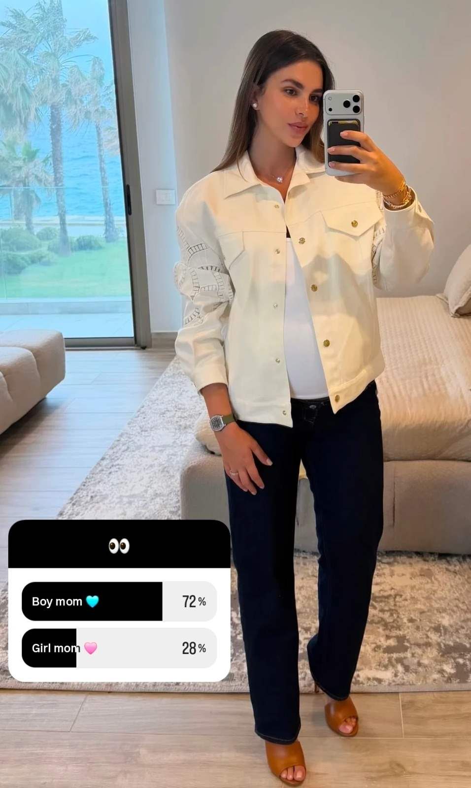 ونشرت الشابة الأردنية عبر خاصية "الستوريز" صورة عفوية بإطلالة بيضاء، وطرحت سؤالًا على متابعيها حول جنس الجنين، فاتحة باب التصويت بين ذكر وأنثى. وقد أظهر التفاعل أن الغلبة كانت لخيار الذكر، من دون أن تعلن حتى الآن بشكل رسمي عن جنس مولودها.