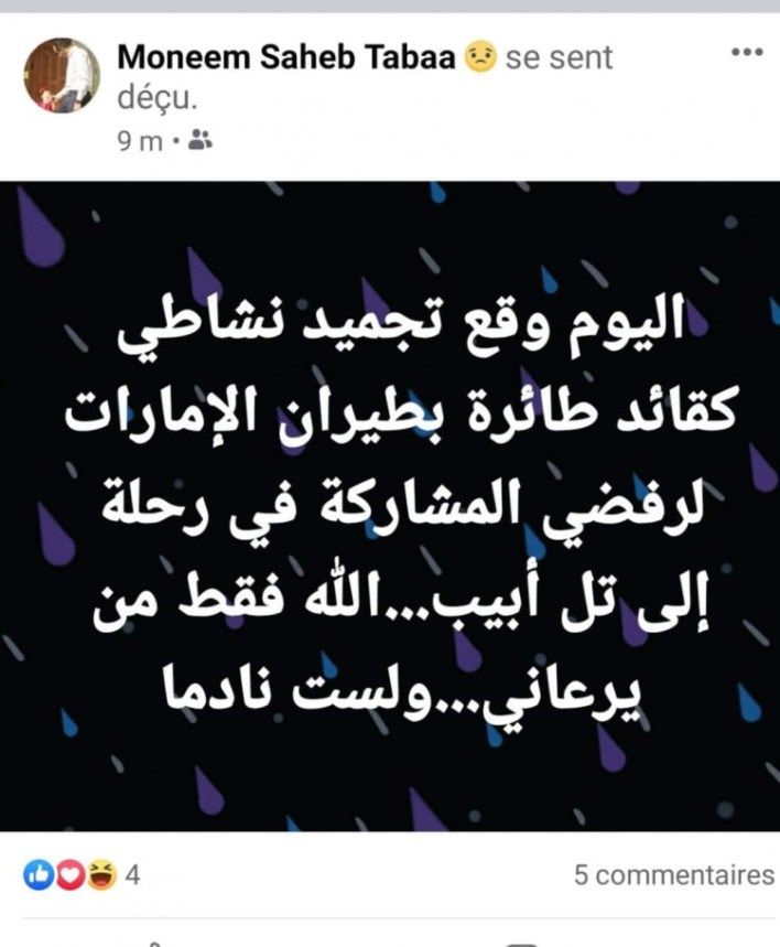 وكتب صاحب الطابع في تدوينة نشرها على صفحته الرسمية بموقع فيسبوك اليوم الثلاثاء 12 كانون الثاني (يناير) 2021: “تم تجميد نشاطي كقائد طائرة في طيران الإمارات بسبب رفضي المشاركة في رحلة إلى تل أبيب….. الله فقط من يرعاني… لست نادما”.