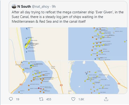 جنحت سفينة حاويات كبيرة أثناء مرورها في قناة السويس، مما تسبب في إغلاق الشريان الدولي، وحدوث زحام في البحر الأبيض المتوسط والأحمر وقناة السويس نفسها، مما دفع بعض السفن لتغير طريقها إلى طريق رأس الرجاء الصالح.