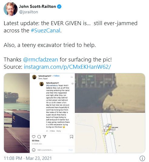 وكتب جوليان كونا، الذي شاهد ما حدث من سفينتها بالمرسى: “آمل ألا يمر وقت طويل جدًا ولكن من مظهرها، فإن تلك السفينة عالقة للغاية. كان لديهم مجموعة من القاطرات تحاول سحبها ودفعها في وقت مبكر لكنها لم تذهب إلى أي مكان … هناك حفار صغير يحاول استخراج المقدمة”.