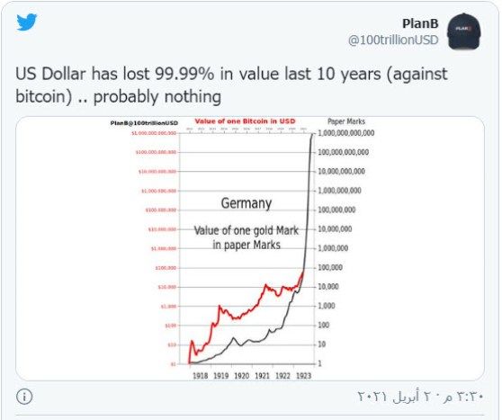 وهذا النموذج أثبت حتى الآن رجاحة توقعاته، وكان قد أنشأه مستخدم على تويتر ” @100trillionUSD”، الذي يقول إنه مؤسسة استثمارية هولندية كبيرة.
