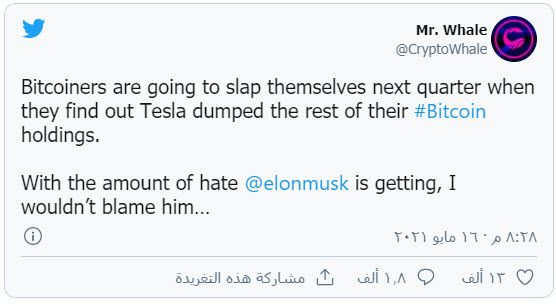 وكان ماسك أكد ما جاء في تغريدة لحساب يسمى CryptoWhale حول إمكانية تخلي الشركة عن أرصدتها من بيتكوين.