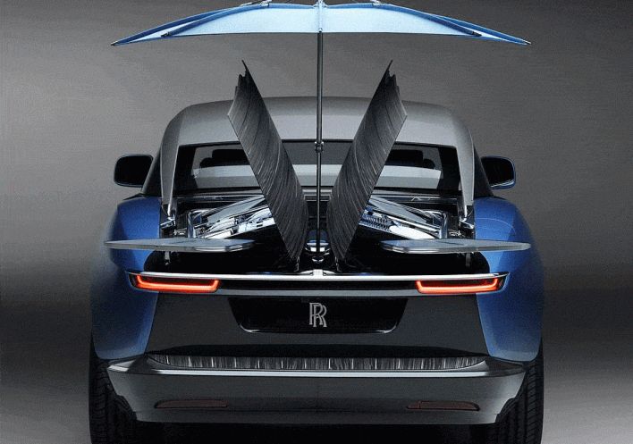 ويضم الجزء الخلفي للسيارة طاولة عشاء وكوكتيل دوارة مع كراسي متناسقة ومظلة تتمدد أوتوماتيكيا عند الرغبة في تناول العشاء في الهواء الطلق.