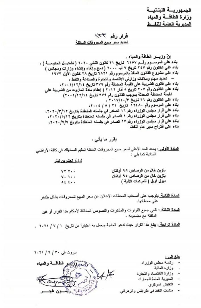 ونشرت وزارة الطاقة والمياه اللبنانية اليوم الخميس جدولا جديدا يحدد السعر الأدنى لـ: