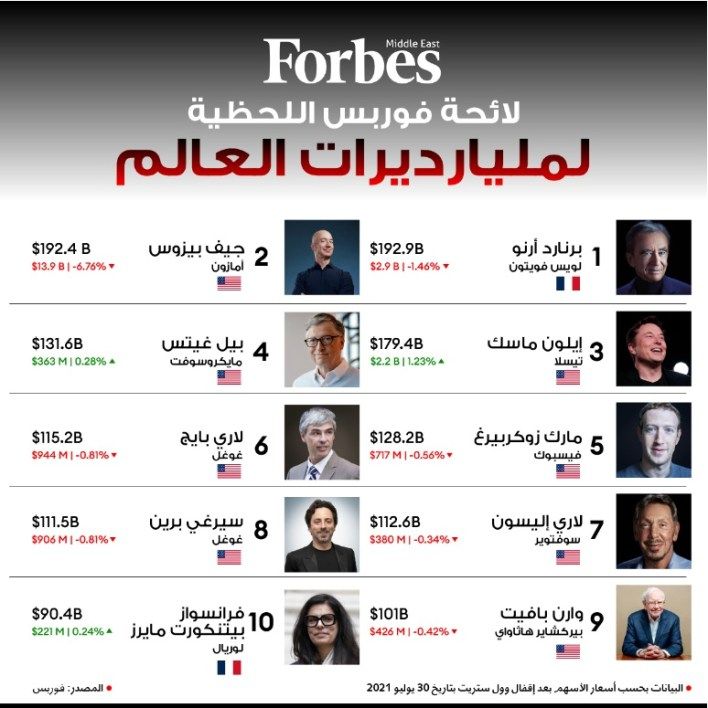 وفي ما يأتي قائمة أغنى 10 رجال وسيدات أعمال في العالم، وصافي ثرواتهم بحسب أسعار الأسهم بعد إغلاق البورصة الأمريكية آخر جلسات الأسبوع بتاريخ 30 تموز/ يوليو 2021، وفقا لقائمة “فوربس”: