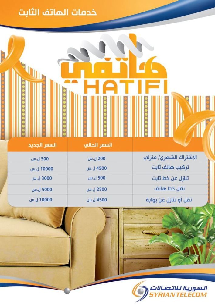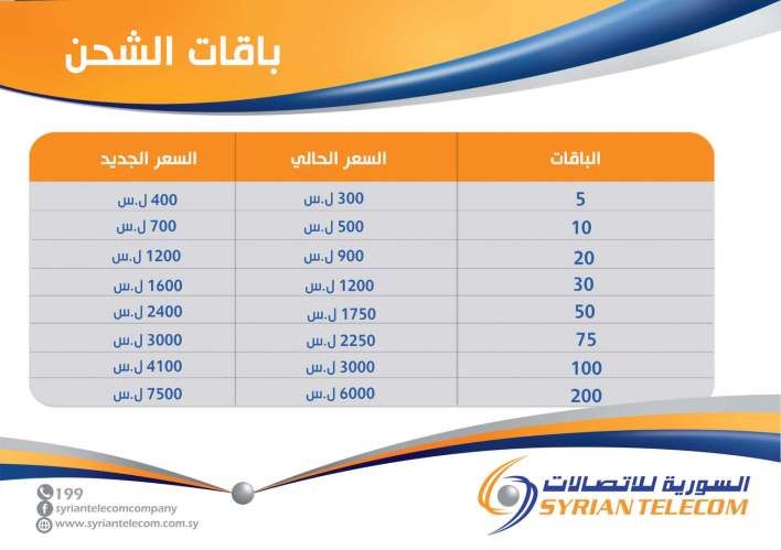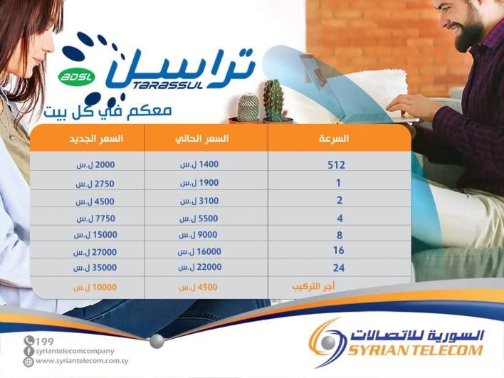 أعلنت الشركة السورية للاتصالات، اليوم الثلاثاء، عن أسعار جديدة لخدمتي الإنترنت والهاتف الثابت في البلاد. وسيتم تطبيق الأسعار الجديدة انطلاقا من شهر أكتوبر 2021.