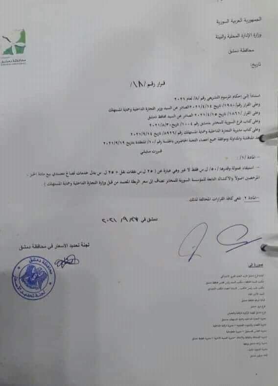 وفي القرار رقم 18 الصادر اليوم أقرت المحافظة استيفاء عمولة قدرها 50 ليرة، 25 ليرة نفقات نقل، و25 ليرة بدل خدمات لصالح معتمدي بيع مادة الخبز المرخصين أصولا والأكشاك التابعة للمؤسسة السورية للمخابز.