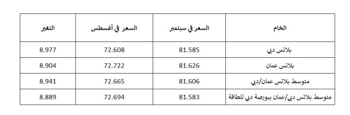 ويشمل الجدول المتوسطات الشهرية لخامي دبي وسلطنة عمان في أكتوبر 2021.