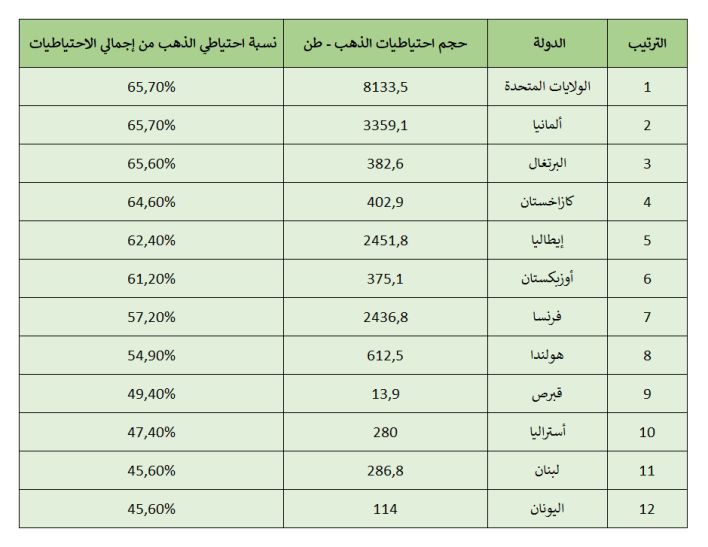 كذلك أظهر التقرير حصة الذهب من إجمالي الاحتياطيات الأجنبية لكل دولة، وتصدر لبنان، الذي يشهد أزمة اقتصادية متصاعدة، الدول العربية بهذا المؤشر، حيث شكل الذهب نحو 45.6% من إجمالي احتياطياته.