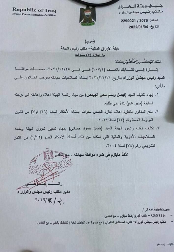 ورد في وثيقة صادرة عن مكتب رئيس الوزراء العراقي مصطفى الكاظمي أن رئيس هيئة الأوراق المالية فيصل الهيمص التمس إعفاءه من منصبه.