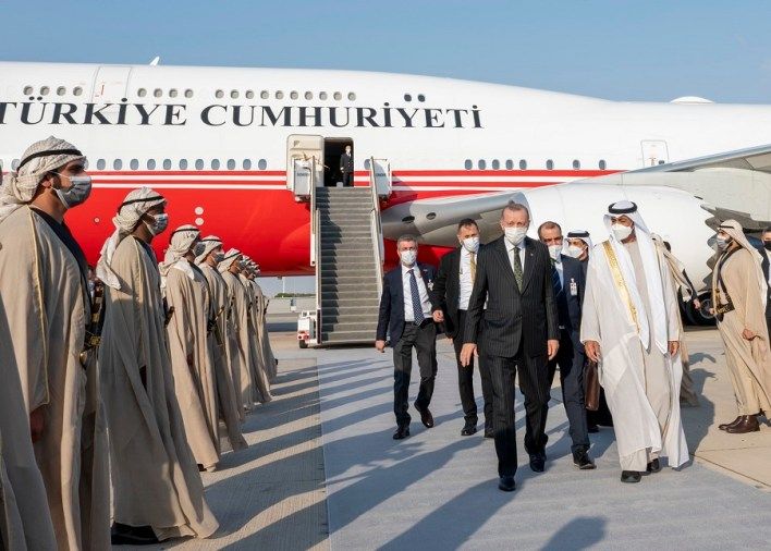 وكان ولي عهد أبو ظبي الشيخ محمد بن زايد آل نهيان، قد استقبل، الرئيس التركي رجب طيب اردوغان، الذي وصل إلى الإمارات، الإثنين، في زيارة تستغرق يومين.