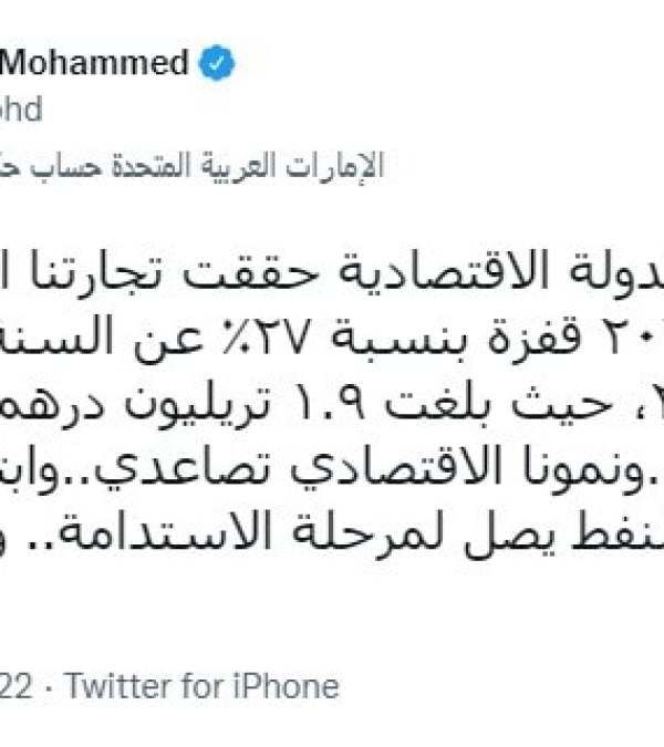 وكتب الشيخ محمد بن راشد في تغريدة عبر حسابه الرسمي على موقع ”تويتر“، قائلًا: ”ضمن تطورات الدولة الاقتصادية حققت تجارتنا الخارجية غير النفطية في 2021 قفزة بنسبة 27 % عن السنة التي قبلها و11 % عن 2019، حيث بلغت 1.9 تريليون درهم“.