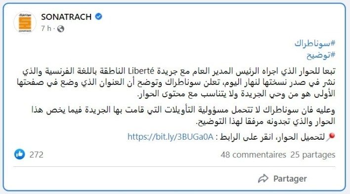 وأضافت: “وعليه فان سوناطراك لا تتحمل مسؤولية التأويلات التي قامت بها الجريدة فيما يخص هذا الحوار”.