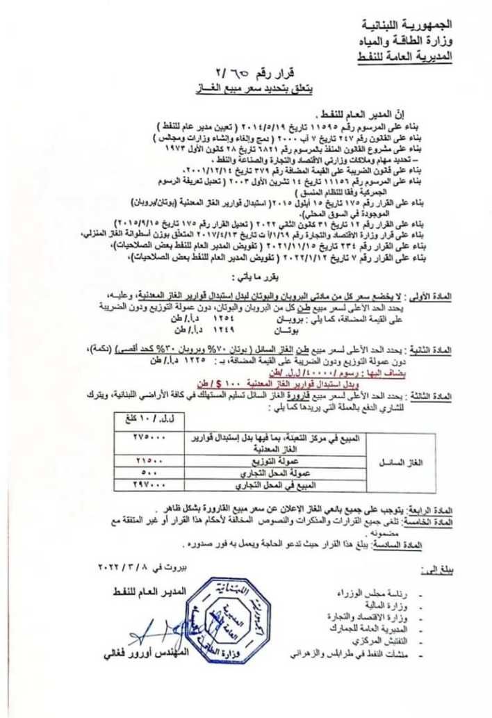 – الغاز 297000 (ارتفع 9000 ل.ل).