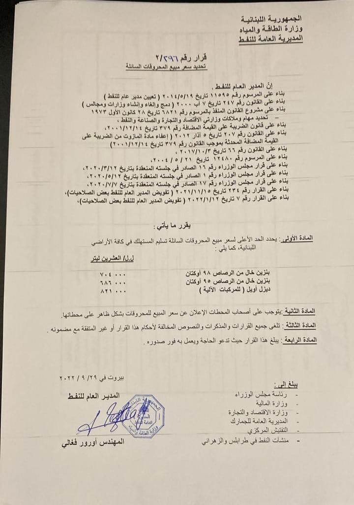 صدر جدول جديد لأسعار المحروقات، اليوم الخميس، وفقاً للآتي: بنزين 95: 686000 (+9000) بنزين 98: 704000 (+10000) مازوت: 821000 (+11000)