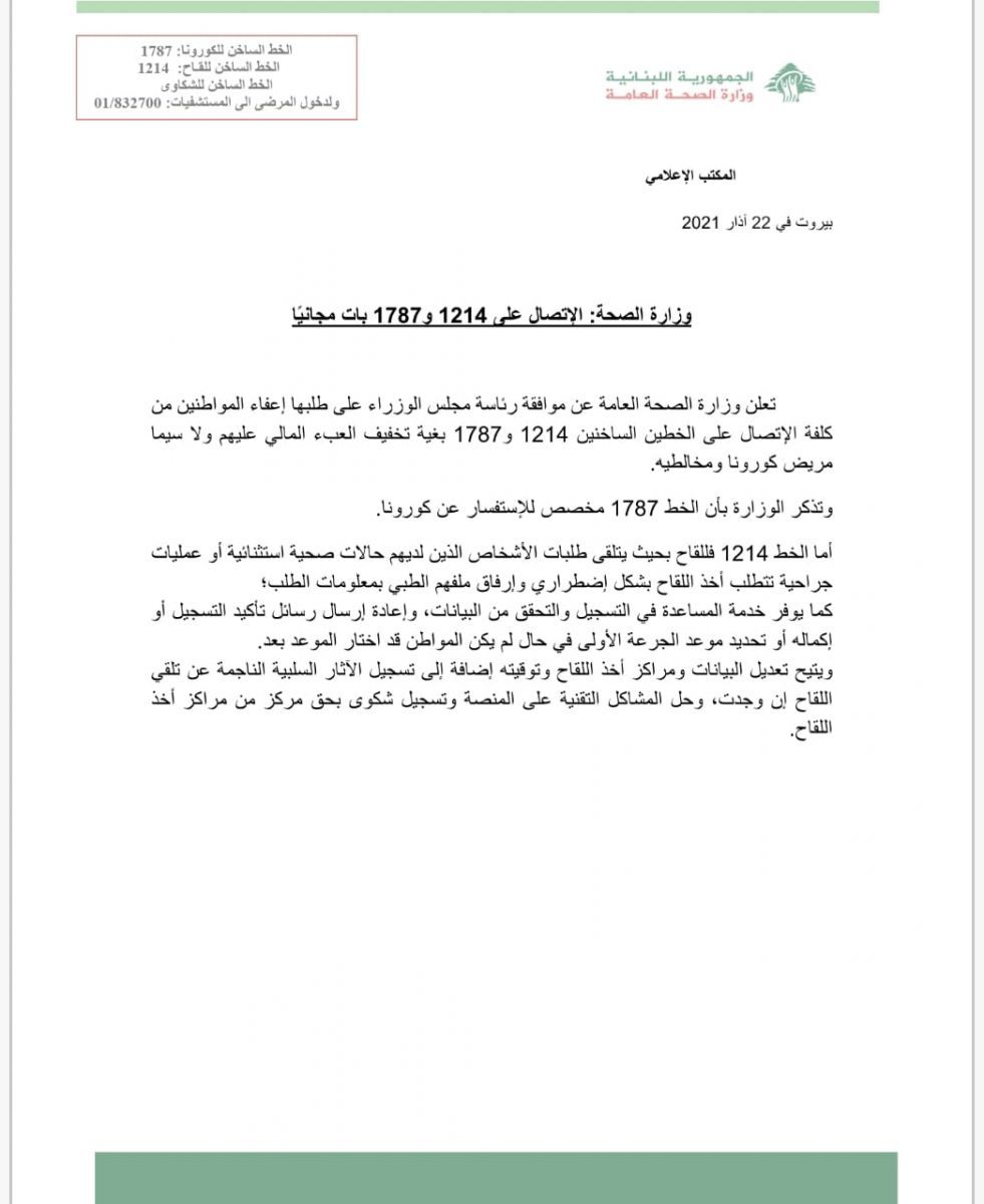 أعلنت وزارة الصحة العامة عن أن مجلس الوزراء وافق على طلبها بإعفاء المواطنين من كلفة الاتصال على الخطين الساخنين 1214 و1787 بغية تخفيف العبء المالي عليها ولا سيما مريض كورونا ومخالطيه.