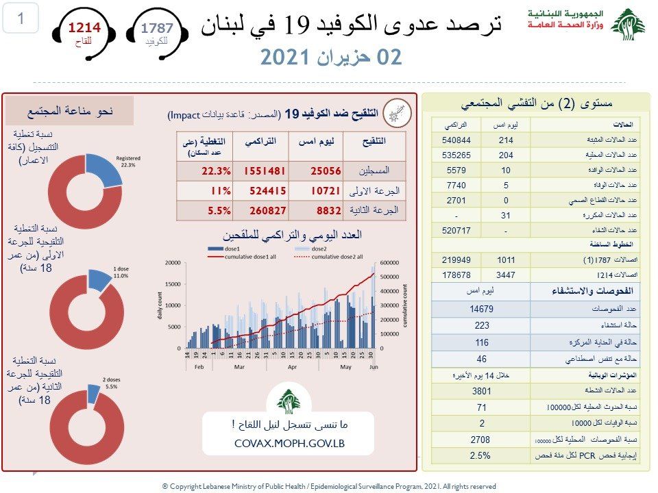 سجل لبنان خلال الـ24 ساعة الماضية 5 حالات وفاة بالإضافة إلى 214 إصابة جديدة بفيروس كورونا حسب ما جاء في التقرير اليومي الصادر عن وزارة الصحة العامة.