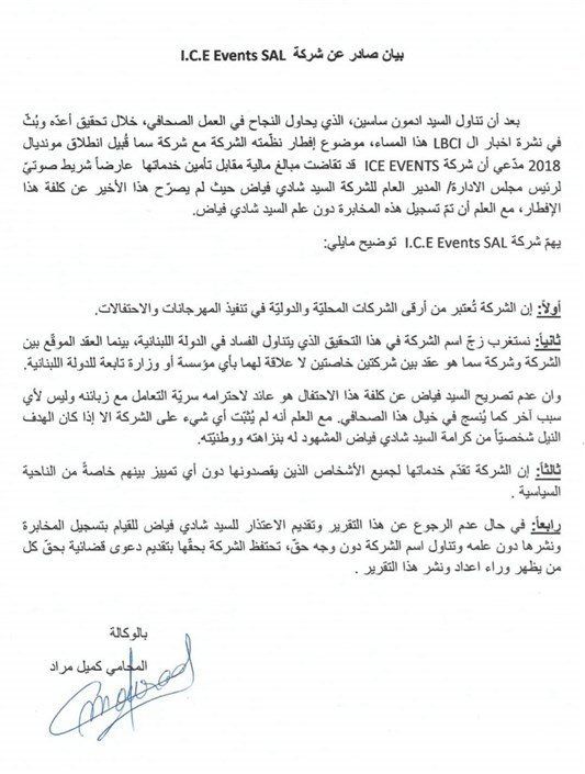 ردّت شركة ICE Events SAL في بيان على التحقيق الذي أعدته قناة الـLBCI في نشرتها المسائية والذي تناول موضوع إفطار نظمته ICE مع شركة سما قُبيل انطلاق مونديال 2018. وأكدت الشركة أنه في حال عدم الرجوع عن التقرير وتقديم الاعتذار للسيد شادي فياض للقيام بتسجيل المخابرة ونشرها دون علمه وتناول اسم الشركة دون وجه حق، تحتفظ الشركة بحقها بتقديم دعوى قضائية بحق كل من يظهر وراء اعداد نشر هذا التقرير.