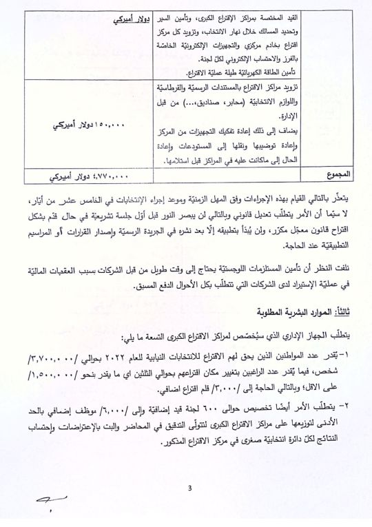 وأشارت الوزارة إلى أن “الدراسة التي طلبها رئيس الحكومة نجيب ميقاتي من الوزارة بعد رسالة من رئيس الجمهورية ميشال عون، خلُصت إلى أنه يتعذّر اعتماد مراكز الاقتراع الكبرى ضمن المهل المفروضة في قانون الانتخاب الحالي في ظل الحاجة لاجراء تعديلات قانونية، إضافة إلى العقبات اللوجستية والاجرائية، والحاجات على صعيد الموارد البشرية والمادية”، لافتة إلى أن “الوقت المطلوب لانجاز التحضيرات لا يقلّ عن خمسة أشهر تبدأ من تاريخ نشر القانون وإصدار المراسيم التطبيقية عند الحاجة، وأنّ الكلفة الاجمالية للمشروع تبلغ حوالي 5،872،500 دولار أميركي”.