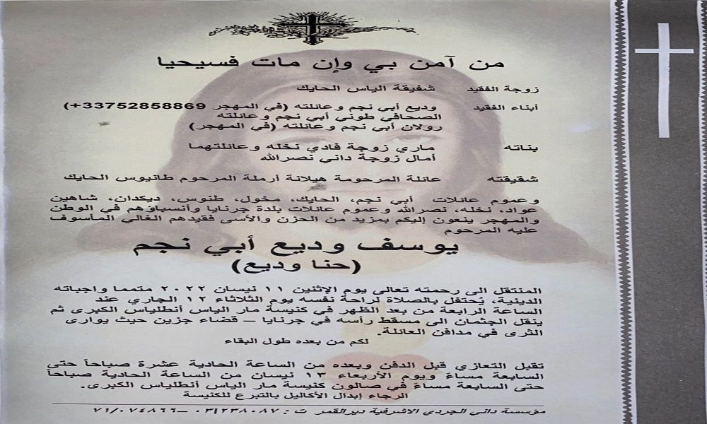 تقبل التعازي قبل الدفن وبعده ويوم الأربعاء 13 نيسان في صالة الكنيسة من الساعة الحادية عشرة صباحا حتى السابعة مساء.