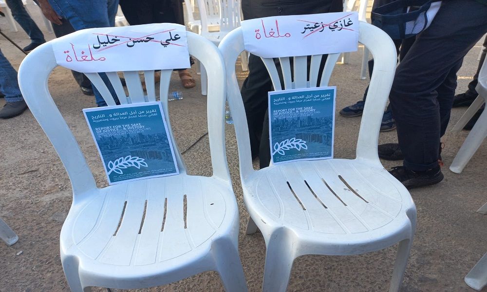 ووضع أهالي الشهداء اسمي النائبين غاز زعيتر وعلي حسن خليل على كرسيين، شطبا بعبارة “ملغاة”.
