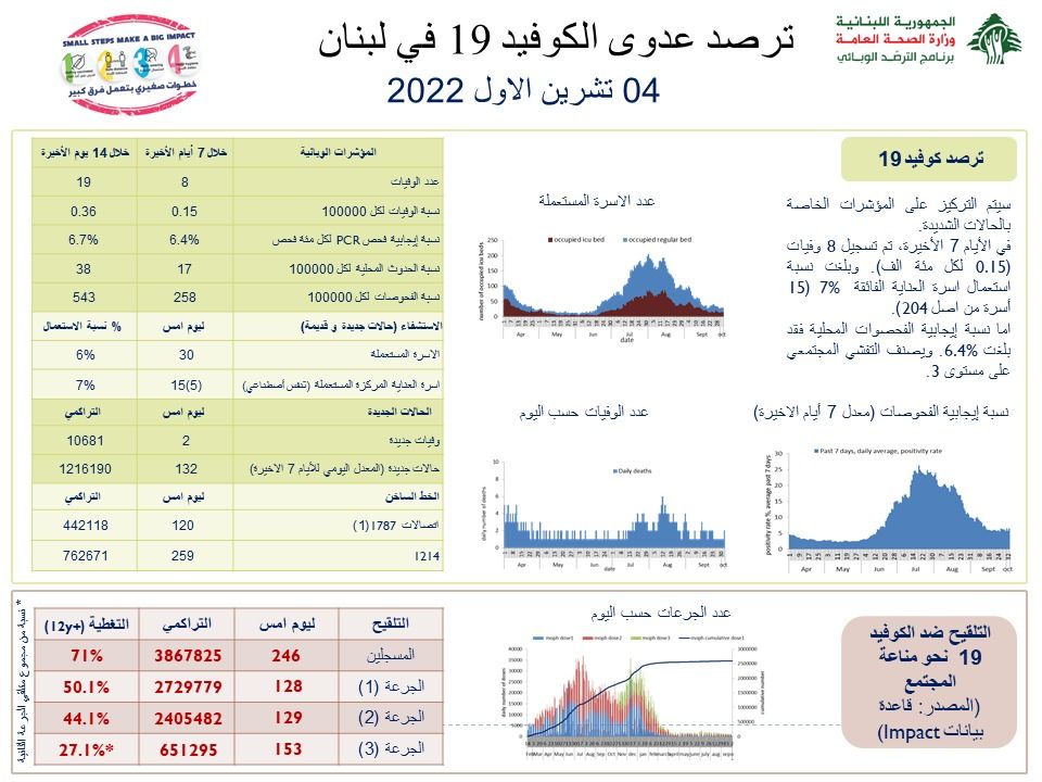 أعلنت وزارة الصحة العامة عن تسجيل 132 إصابة جديدة بفيروس كورونا ليرتفع العدد التراكمي للإصابات منذ بدء انتشار الوباء إلى 1216190. كما وسجل لبنان حالتي وفاة ما رفع العدد التراكمي للوفيات إلى 10681.