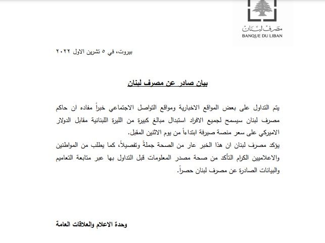 يُؤكد مصرف لبنان أنّ هذا الخبر عار من الصحة جملة وتفصيلا، كما يطلب من المواطنين والاعلاميين الكرام التأكد من صحة مصدر المعلومات قبل التداول بها عبر متابعة التعاميم والبيانات الصادرة عن مصرف لبنان حصرا.