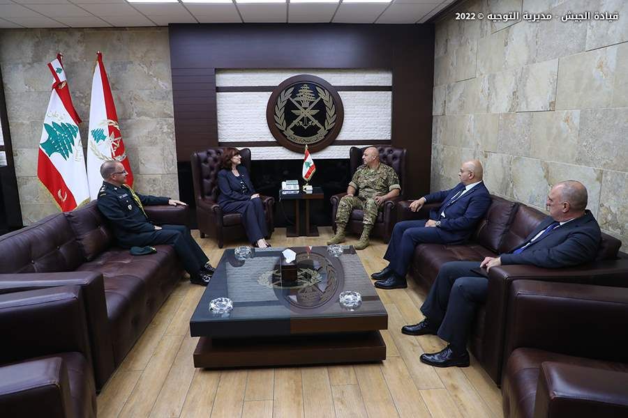 استقبل قائد الجيش العماد جوزاف عون في مكتبه في اليرزة السفيرة الكندية في لبنان السيدة Stefanie MCCOLLUM يرافقها الملحق العسكري الكندي العقيد Gino CHRETIEN، ثم ملحق الدفاع الأميركي العقيد Brian DUNN، يرافقه الملحق العسكري المقدم Adam Kordish في زيارتي تعارف لمناسبة تسلم السفيرة MCCOLLUM والعقيد DUNN مهماتهما في لبنان.