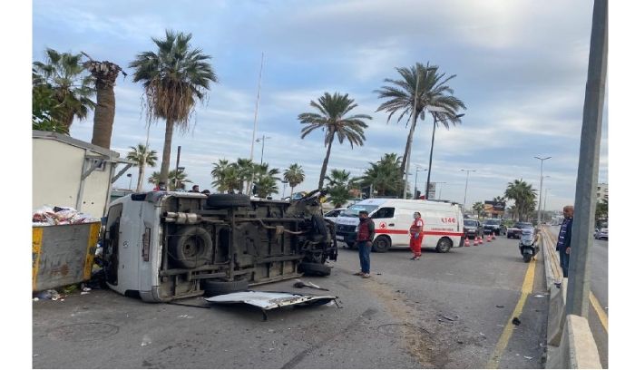جرح شخصان في اصطدام فان لنقل الركاب في شارع رياض الصلح في صيدا بالحاجز الوسطي للطريق ما ادى الى انقلابه.