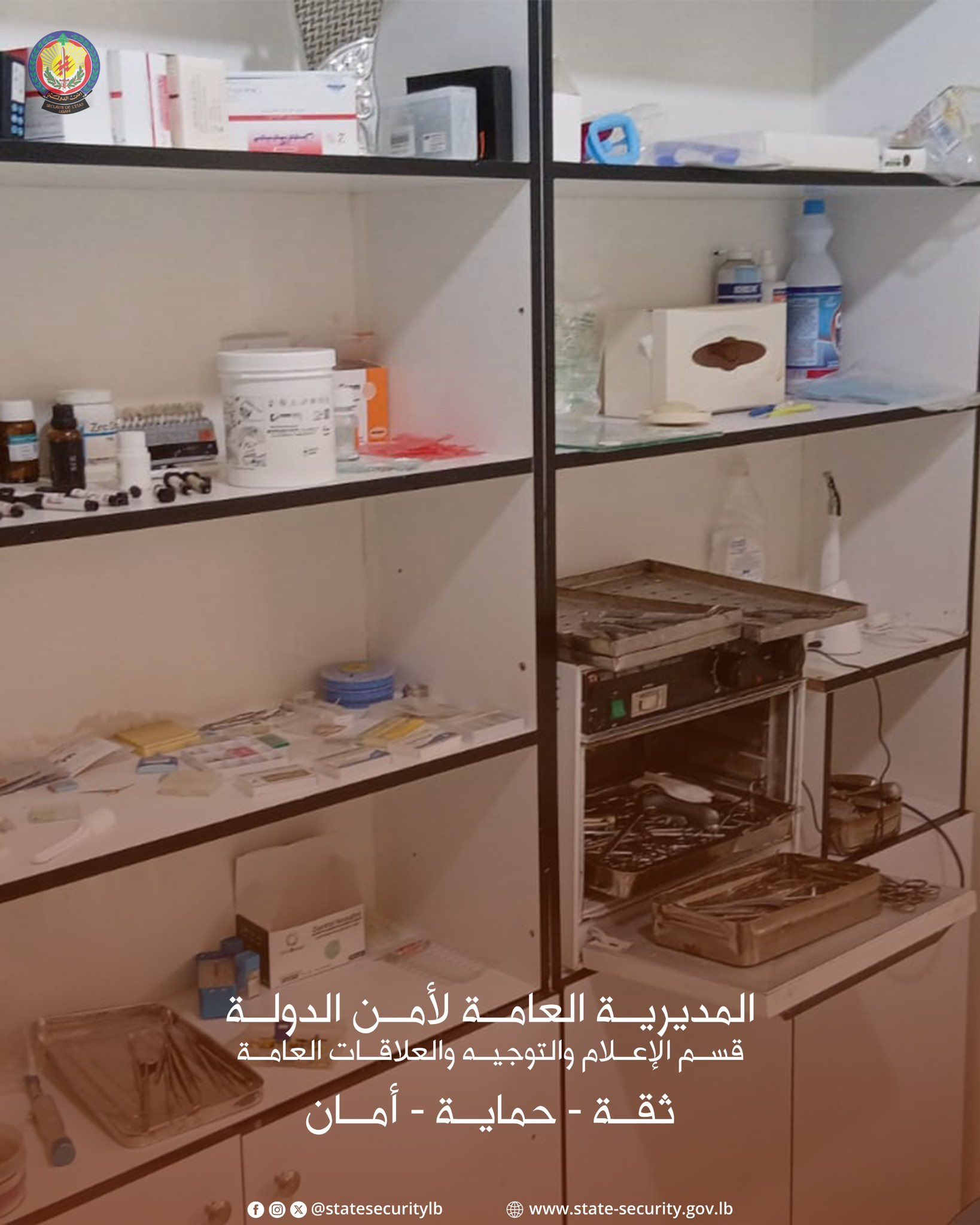 داهمت دورية من مديرية الشمال الإقليمية – مكتب المنية – الضنية في أمن الدولة، بتاريخ ٢٢/١/٢٠٢٦، مستوصفًا طبيًا غير مرخّصًا في محلة المنية، وتم توقيف كل من المدعو (ع. ف.) يعمل بصفة طبيب أسنان والمدعوة (ت. س.) تعمل بصفة قابلة قانونية وكلاهما من الجنسية السورية ويمارسان الطب بصورة غير شرعية. تم ضبط كمية من الأدوية المهرّبة، بعضها منتهي الصلاحية، إضافةً إلى أكياس مصل وخيوط تُستخدم لتقطيب الجروح ومعدّات طبية مختلفة.