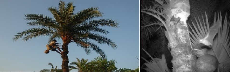 خفاش صوّروه يشرب من نسغ التمر النازف كالإنزيم من جذع النخلة الى جرة يضعونها ليتجمع فيها