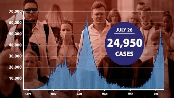 كانت تحذيرات سابقة، ذكرت أن بريطانيا ستشهد 100 ألف إصابة يوميا بدءا من 19 يوليو الجاري، أي "يوم التحرير" الذي رفعت فيه الحكومة كل القيود، بما فيها ارتداء الكمامة، وفقا لما طالعت "العربية.نت" بوسائل إعلام محلية. لكن ما حدث كان ما استغربه كثيرون، منهم الدكتور Christopher Jewell بروفسور علم الأوبئة في جامعة Lancaster University البريطانية، والمتفائل بمعرفة مزيد من المعلومات الأسبوع المقبل تكشف عن السبب، وفقا لما يمكن استنتاجه مما نقلته عنه صحيفة "التايمز" اليوم.