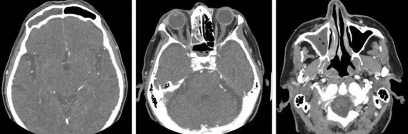 إلى ذلك، كشف التصوير المقطعي أن مصدر معاناة المريض هو التهاب الجيوب الأنفية الذي يمتد إلى الجانب الأيمن من وجهه.