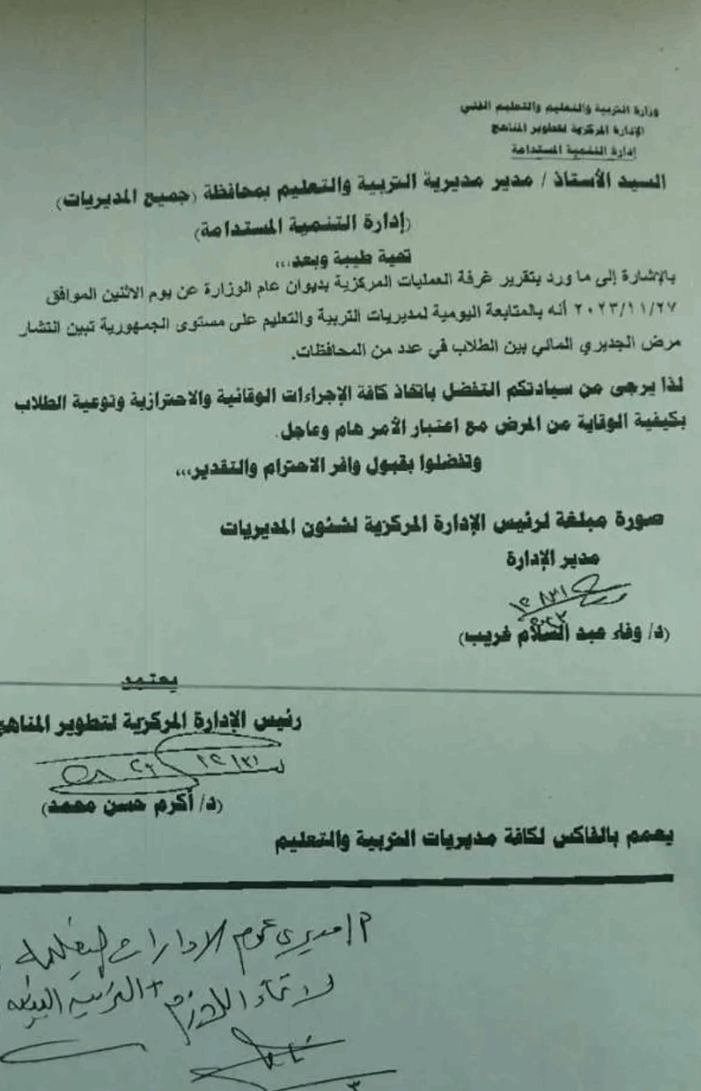 وأرسلت الوزارة خطابا مهما وعاجلا للمديريات التعليمية بجميع المحافظات، حول انتشار مرض الجديري المائي بين الطلاب في عدد من المدارس بالمحافظات، وذلك بعدا تلقت تقريرا يفيد ذلك. وطالبت باتخاذ كافة الإجراءات الوقائية والاحترازية، وتوعية الطلاب بكيفية الوقاية من مرض الجديري المائي، مع اعتبار الأمر مهما وعاجلا.