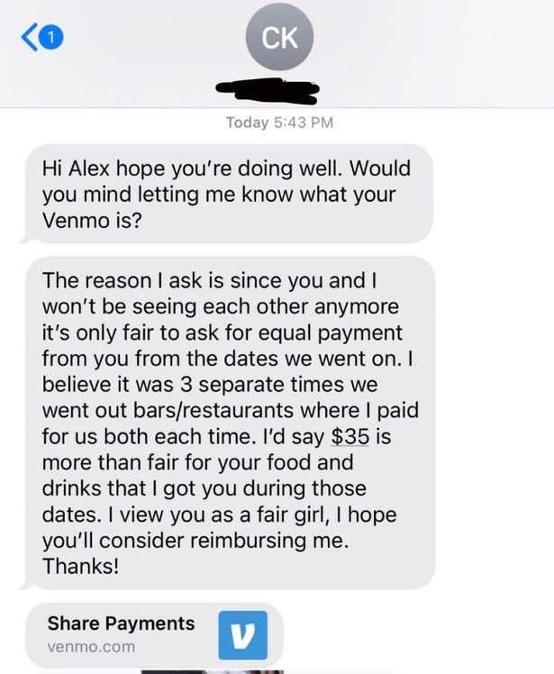 وأكمل: “أعتقد أنها كانت ثلاثة مقابلات منفصلة ذهبنا فيها إلى الحانات والمطاعم حيث دفعت لنا في كل مرة، سأقول إن 35 دولارًا أكثر من عادلة لطعامك ومشروباتك التي حصلت عليها خلال تلك التواريخ، أنا أعتبر ذلك كفتاة عادلة، آمل أن تفكر في تعوضني عن ذلك، شكرا!”.
