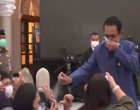 سجلت كاميرات صحفيين في العاصمة التايلاندية بانكوك الثلاثاء 9 مارس سلوكا غريبا لرئيس وزراء البلاد برايوت تشان أوتشا وهو يرش الصحفيين بالمطهر قبل مغادرة مؤتمره الصحفي.