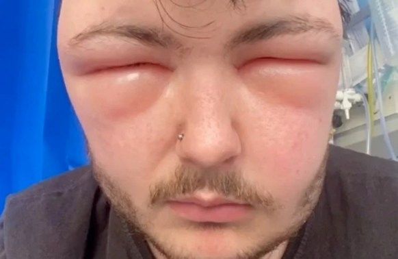واتضح في الفيديو، كيف أن التورم الخفيف على إحدى العينين أدى في النهاية إلى نمو حجم وجهه بالكامل وتحويله إلى اللون الأحمر الفاتح؛ ليتم نقله فورًا إلى المستشفى، فيما كان يجب إجراء اختبار الحساسية قبل الاستخدام الكامل للصبغة.
