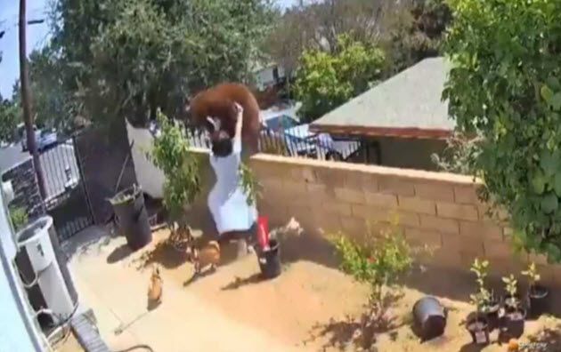 انتشرت بشكل واسع على الإنترنت مؤخرا لقطات فيديو لفتاة مقيمة في ولاية كاليفورنيا، خلال مواجهتها لدب مفترس بعد صعوده فوق سور منزلها ومهاجمة كلابها.