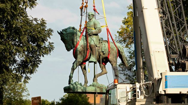 واستُخدمت رافعة لإزالة التمثالين اللذين يجسدان الرجلين بالزي العسكري يمتطي كل منهما حصانا، تحت أنظار حشد مرحّب بالخطوة في مدينة فرجينيا.