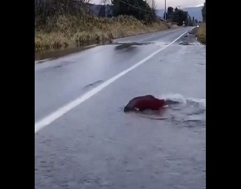 انتشر فيديو على مواقع التواصل الاجتماعي يظهر سمكة سلمون أثناء محاولاتها قطع طريق أسفلتي خلال انجراف مياه الأمطار.