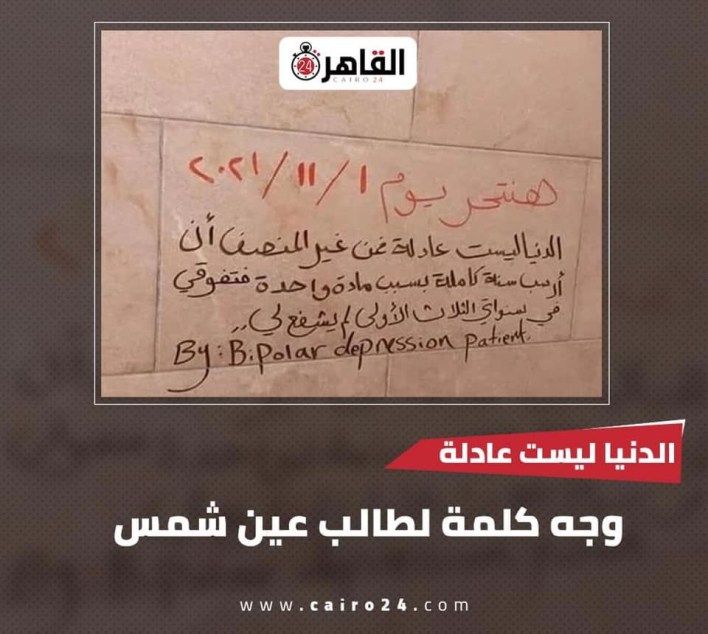 وكشف أن الطالبة بالفرقة الرابعة، هددت بإنهاء حياتها في أول يوم من شهر نوفمبر المقبل، بسبب رسوبها في إحدى المواد ونتج عنه إعادة السنة الدراسية، إذ كتبت على جدران دورات المياه بكلية الطب في جامعة عين شمس: “الدنيا ليست عادلة، فمن غير المنصف أن أرسب سنة كاملة بسبب مادة واحدة فقط، فتفوقي خلال الثلاث سنوات الأولى لم يشفع لي”، موضحة أنها تعاني من مرض نفسي يدعى ثنائي القطبي.