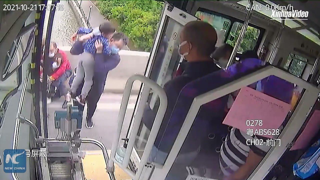 وتظهر في اللحظات الأم والطفل، خلال سيرهما على جسر مخصص للسيارات فوق أحد الأنهار في المقاطعة، بالتزامن مع مرور حافلة نقل عامة.