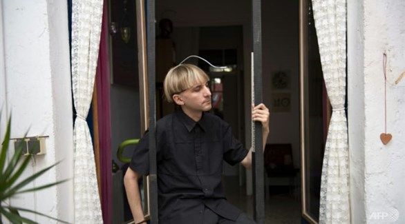 وللوهلة الأولى، يشبه الهوائي الموضوع فوق رأسه مصباحاً غريباً. لكنه يلتقط ترددات الألوان ويحولها إلى اهتزازات تصل من طريق العظام إلى الأذن الداخلية.