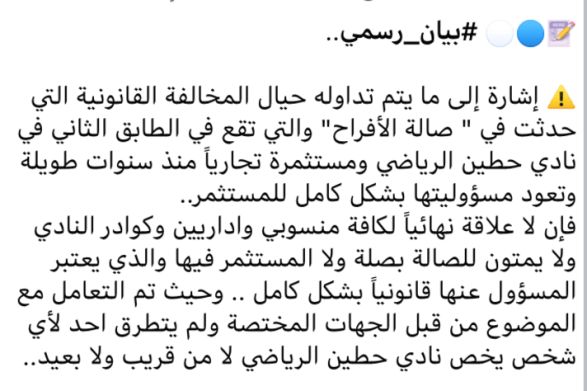 في المقابل، قال نادي حطين الرياضي، عبر حسابه في فيسبوك، إن “ما يتم تداوله حيال المخالفة القانونية التي حدثت في صالة الأفراح والتي تقع في الطابق الثاني من نادي حطين الرياضي، والمستثمرة تجاريا،منذ سنوات طويلة، وتعود مسؤوليتها بشكل كامل للمستثمر”.