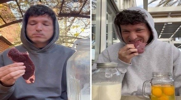 ويقول الرجل إنه كان يتبع نظاماً غذائياً نباتياً في السابق، لكنه بدأ يعاني من مشاكل صحية بسببه، لذلك بدأ بتدريب معدته على هضم اللحوم غير المطهية، بالإضافة ‘لى حليب الحيوانات النيئ والبيض النيئ.