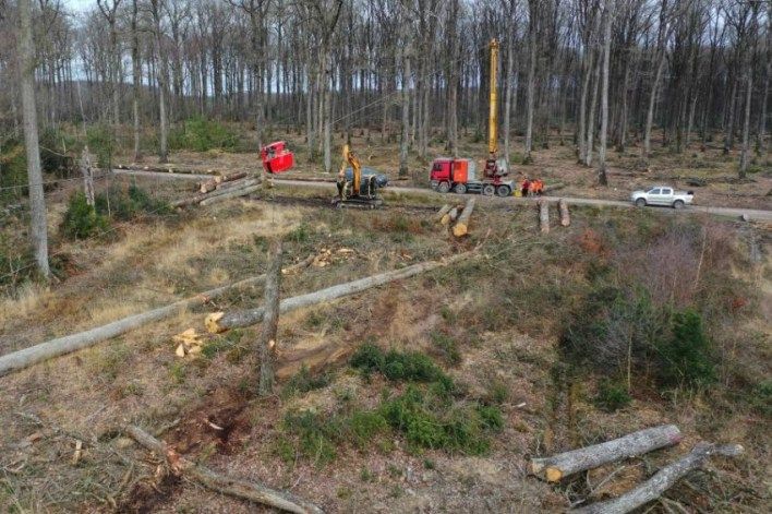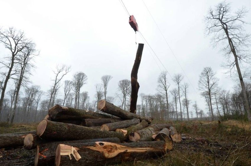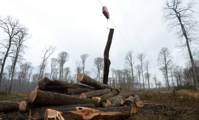 يرفع مزارعون جذوع أشجار البلوط في غابات فرنسا التي يزيد عمرها على 200 عام باستخدام حصيرة من الكابلات، ممتدة عند قمم الأشجار، في فوريه دي بيرس، وفي ماريني ليلي، شمال غرب فرنسا.