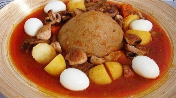 يتكون طبق البازين من عجينة كبيرة مصنوعة من دقيق الشعير، تقدم وسط يخنة فاخرة تعتمد على الطماطم.