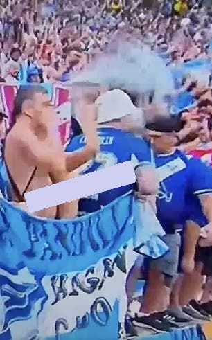 وعلى الرغم من أن المشجعة حاولت الاستتار خلف علم بلادها الكبير، إلا أن عدسات الكاميرات تمكنت من التقاط اللقطة “الصادمة” التي يعتذر موقع البوابة نشرها.