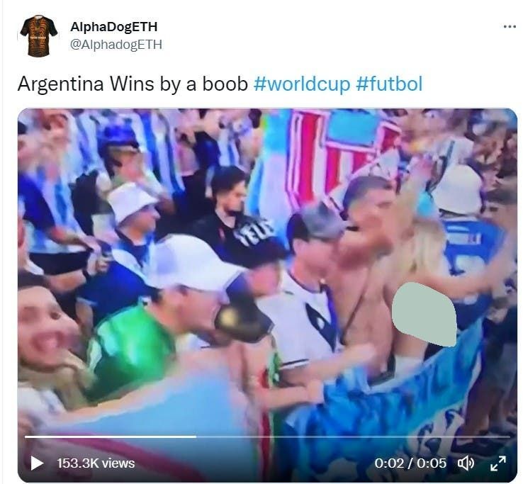 لكن للأسف، اللقطة حقيقة وتم رصدها من مدرجات لوسيل مساء أمس وتحديدًا في اللحظة التي تلت ركلة الجزاء التي نفذها الأرجنتيني “جونزالو مونتيل” في مرمى الديوك، حين انتقلت الكاميرات نحو المشجعين الأرجنتينيين المبتهجين وكان من بينهم المشجعة الشقراء العارية.