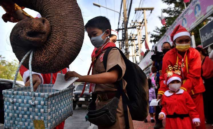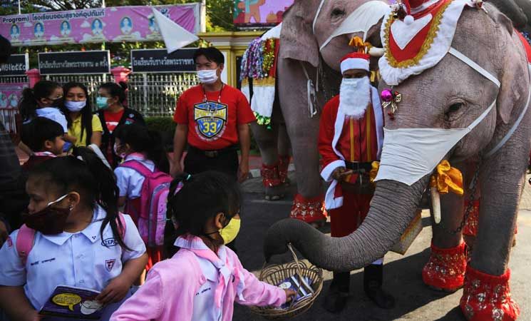 ارتدى راكبو الأفيال زي بابا نويل وقادوا الحيوانات العملاقة إلى مدرسة في وسط تايلاند لتوزيع هدايا عيد الميلاد على نحو ألفي طالب هذا الأسبوع، وهو جزء من تقليد سنوي متبع في البلاد.